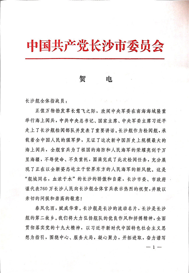 正值万物勃发草长莺飞之际,欣闻中央军委在南海海域隆重举行海上阅兵,中共中央总书记、国家主席、中央军委主席习近平走上了长沙舰检阅部队并发表了重要讲话。长沙舰作为检阅舰,承载着全中国人民的强军梦,见证了这次新中国历史上规模最大的海上阅兵,全舰官兵为了祖国的海防和人民海军的荣耀亮剑于万里海疆,不辱使命、不负重托,圆满完成了此次检阅任务,充分展现了正在以全新姿态屹立于世界东方的人民海军的新风貌。这是“舰城同名,血浓于水”的长沙的骄傲和自豪,长沙市委、市政府谨代表760万长沙人民向长沙舰全体官兵表示热烈的祝贺,并致以亲切的问候和崇高的敬意!