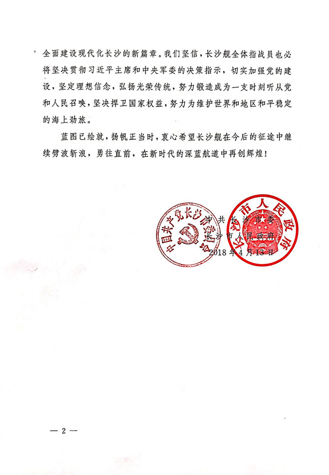 刚刚,长沙市委市政府向长沙舰发去贺电