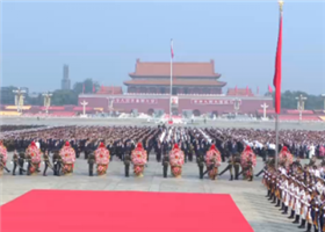 方阵前,以中共中央,全国人大常委会,国务院,全国政协,中央军委,各民主党派、全国工商联和无党派爱国人士,各人民团体和各界群众,老战士、老同志和烈士亲属,中国少年先锋队名义敬献的9个大型花篮一字排开,花篮红色缎带上书写的“人民英雄永垂不朽”格外醒目。