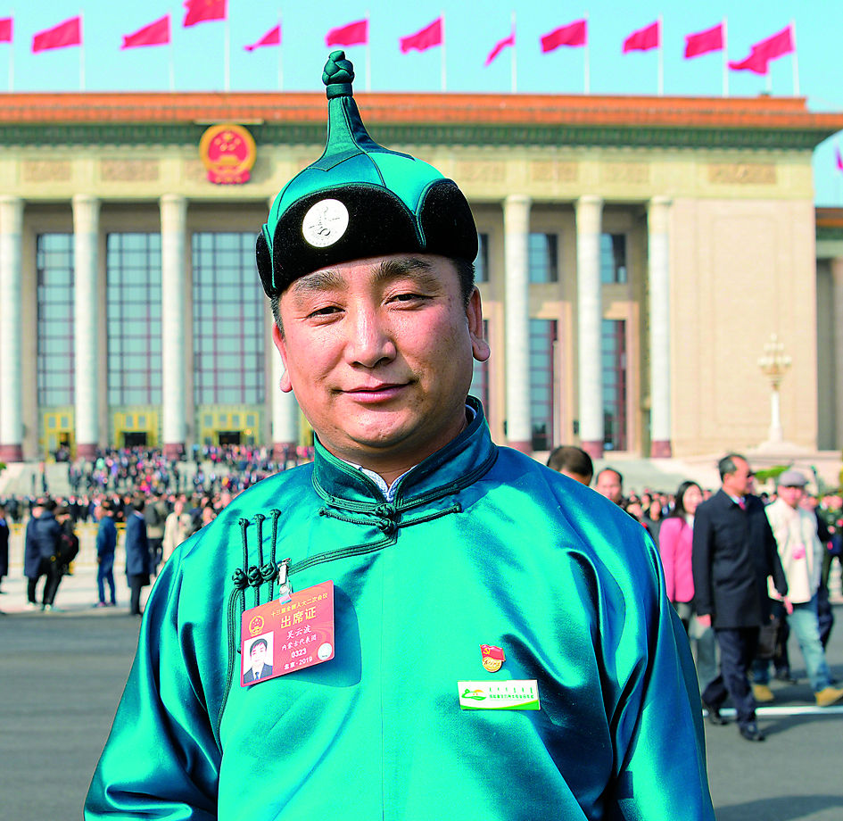 2019年全国两会,我见到总书记时说“总书记您好”,又用蒙语说了一遍“总书记赛白努”,抱着胸脯敬了个礼。