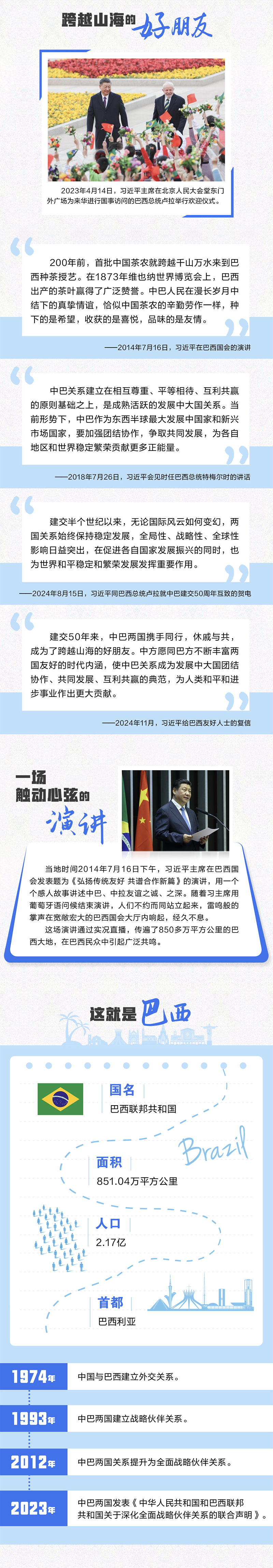 建交半个世纪以来,中巴友谊不断加强,合作日益多元。让我们跟随习主席,一起走进这个因桑巴而美誉全球的南美洲最大国家。