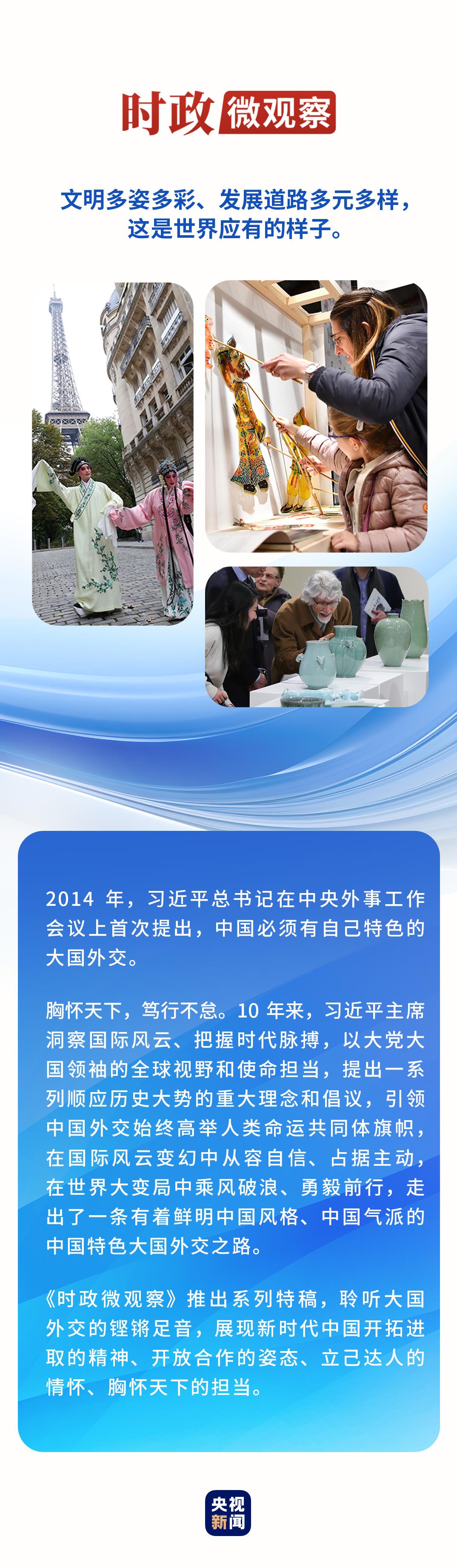 文明如水,润物无声。回望中国特色大国外交的10年历程,习近平主席以开阔的文化视野、深厚的文化积淀和坚定的文化自信,亲自推动不同文明交流交融、互学互鉴,为建设美好世界注入深厚持久力量。