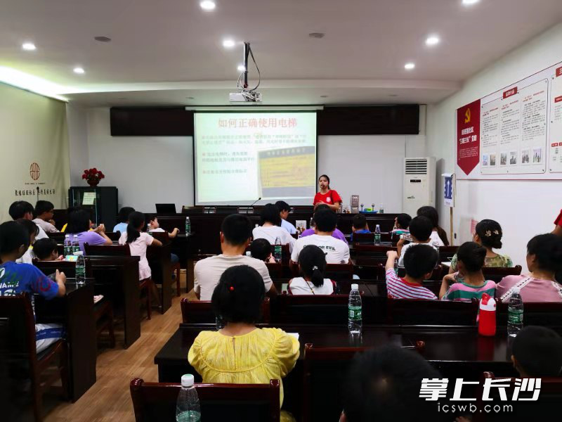 “你们知道掉进水里该怎么自救吗?”“乘坐电梯时,电梯发生故障怎么办?”“报火警要告诉消防员什么?”在一个个问题的引入下,望城区应急管理局的志愿者分别从如何正确乘坐电梯、家庭安全用电、消防知识、交通安全、防溺水知识等几个方面,讲解了在遇到紧急情况时,第一时间如何正确实现求救和自救,以减少不必要的伤亡和损失。
