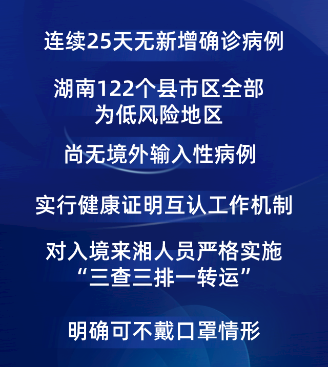 3月23日,省联防联控机制对各县市区疫情风险等级分类进行了调整,低风险等级县市区增加17个,全省122个县市区全部为低风险地区。省政府新闻办在新闻发布会上再次确认这一消息,说明湖北情况转好,连带湖南的防疫形势也向好。