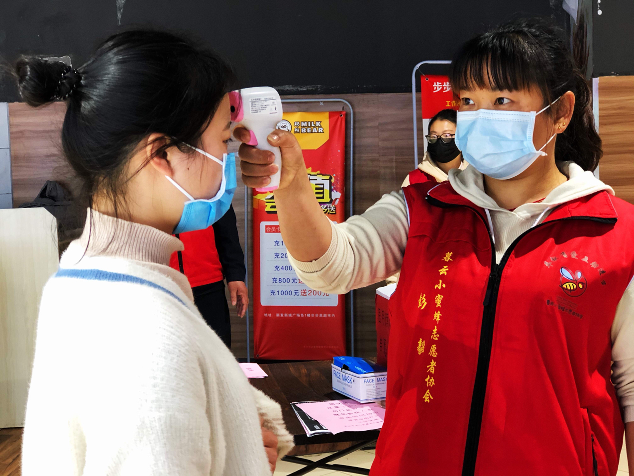 小蜜蜂志愿者协会志愿者在超市等公共场所为顾客测量体温