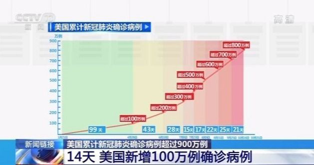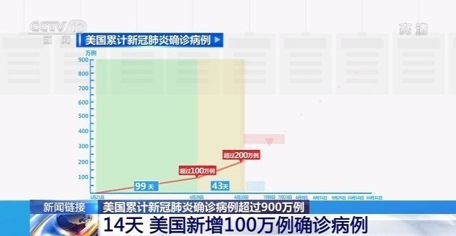 长沙晚报掌上长沙10月31日讯 据央视新闻消息 目前,美国累计新冠肺炎确诊病例已超过900万例。此前,从700万例到800万例,用了21天,而从800万例到900万例,仅仅用了14天——美国的确诊病例数攀升速度再次加速。