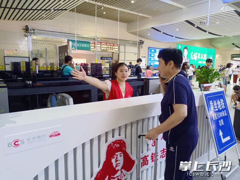 “您好,坐地铁请往右边直走到头,两侧都有入口。”“进站直梯请往左边走。”一大早,来自长郡双语雨花中学的杨毅杰在长沙火车南站出站通道口的服务台微笑地为旅客指引方向,今天是他这个暑假到长沙火车南站当志愿者的第20天。“以前每次都是跟着班级一起来站区当‘3小时志愿实践课’,感觉很有意义,于是就报名了‘日行一善’志愿服务。”他告诉记者,他已经是长沙火车南站地区的三星级志愿者(累积志愿服务时长达120小时)。