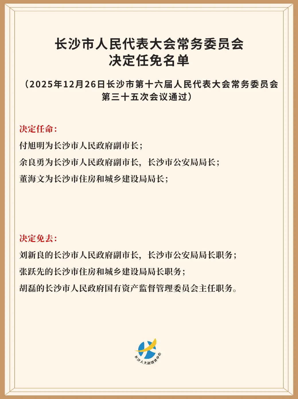 长沙市人民代表大会常务委员会决定任免名单 稿源:长沙人大2025-12-26 20:10 相链区块链 该文章已上链>> 您的浏览器不支持 video 标签。 您的浏览器不支持 audio 标签。 【作者:】 【编辑:黎隽希】 长沙晚报社版权声明 关键词: >>我要举报