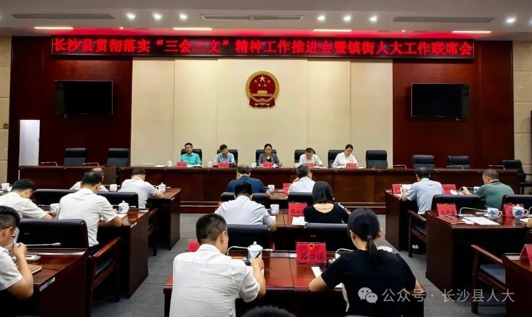 9月18日上午,长沙县贯彻落实“三会三文”精神工作推进会暨镇街人大工作联席会召开,县人大常委会主任周虔,副主任喻名团、曹伟兴、黄泽红、陈卫球参加。