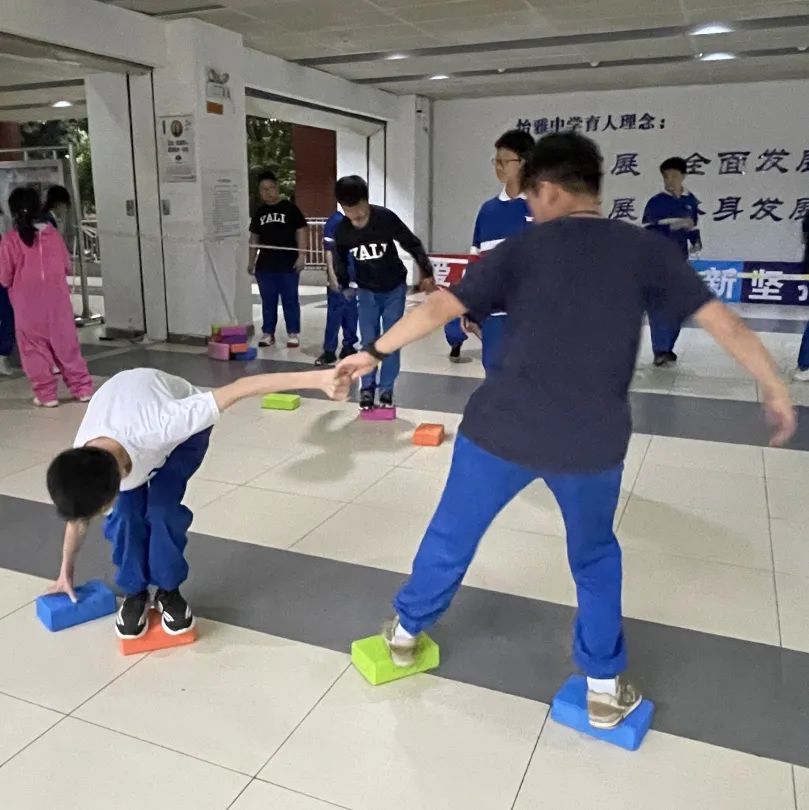 心理趣味闯关嘉年华活动现场,闯关选手两两组队,共同协作闯过三关(摸石过河、负重越荆棘、遇见不一样的我),同学们在活动中放松心情,加强合作。