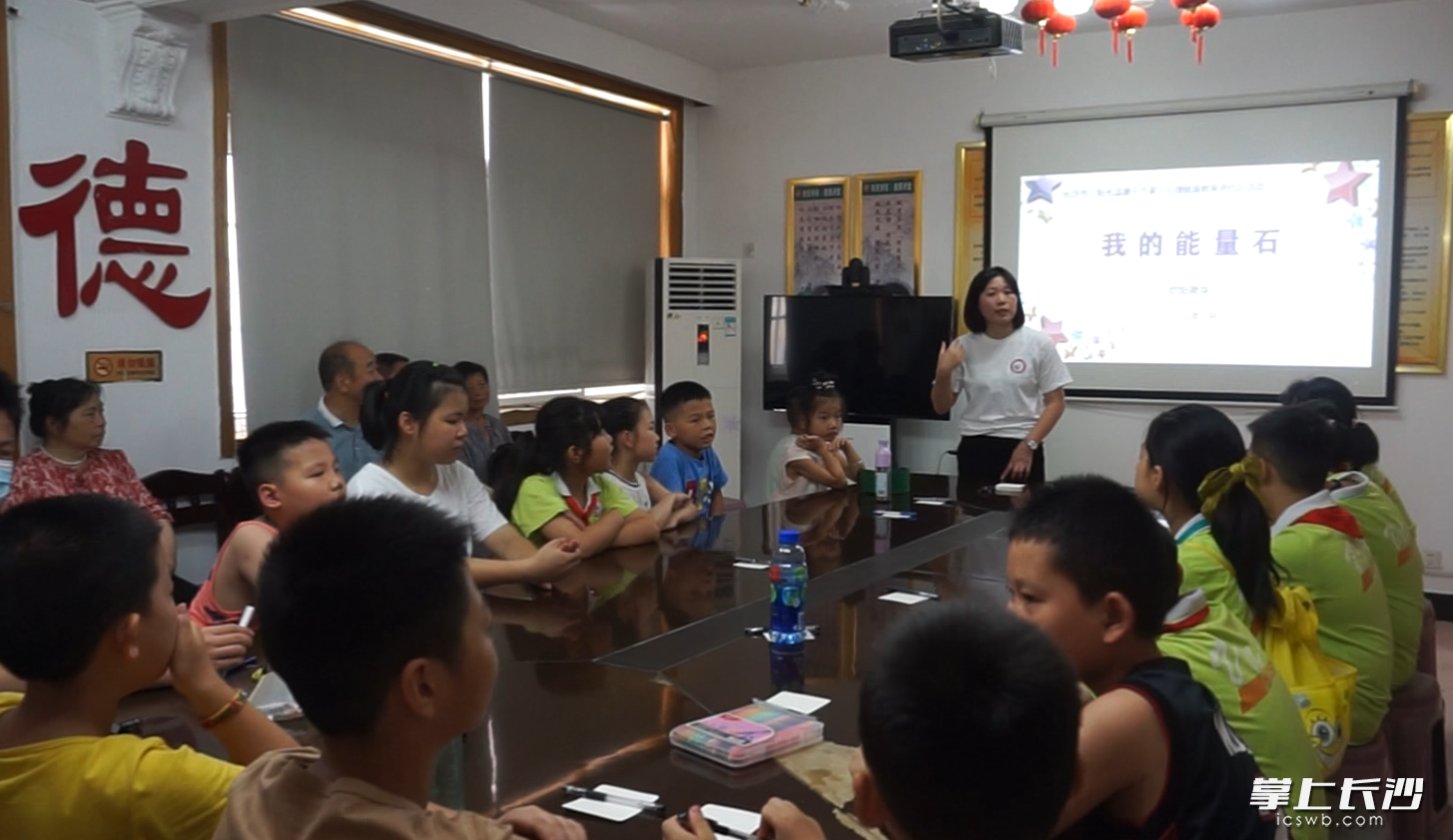 讲座由欧阳艳华老师主讲。她是长沙市未成年人思想道德建设入库专家、湖南省优秀辅导员、国家二级心理咨询师。结合工作实践,欧阳艳华说,每一个孩子都是独一无二的,都是一个待开发的资源宝库。这次讲座之暑假小课堂,设在新天社区二楼会议室。讲座中,欧阳艳华老师让孩子们绘制能量石,讲解、探索能量石文化,链接自己的能量石,激发在座少年们的责任担当,引导他们清晰、准确地认识自我。