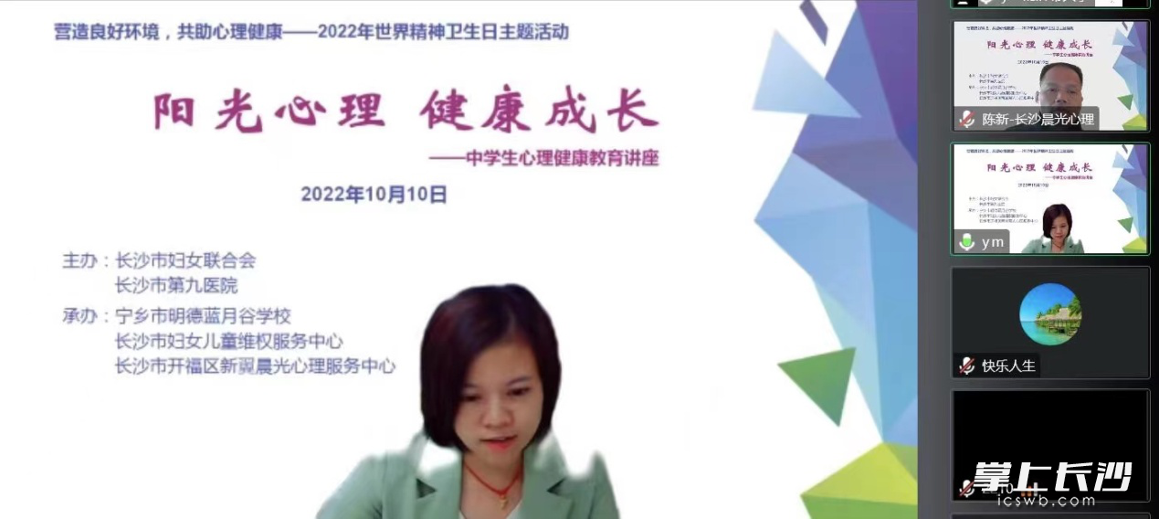 1300余名宁乡市明德蓝月谷学校初中部师生通过线上直播的形式参加了本次活动。活动由宁乡市明德蓝月谷学校、长沙市妇女儿童维权服务中心、开福区新翼晨光心理服务中心联合承办。明德蓝月谷学校校长黄乐、副校长罗又新,开福区新翼晨光心理服务中心主任陈伟军参加。