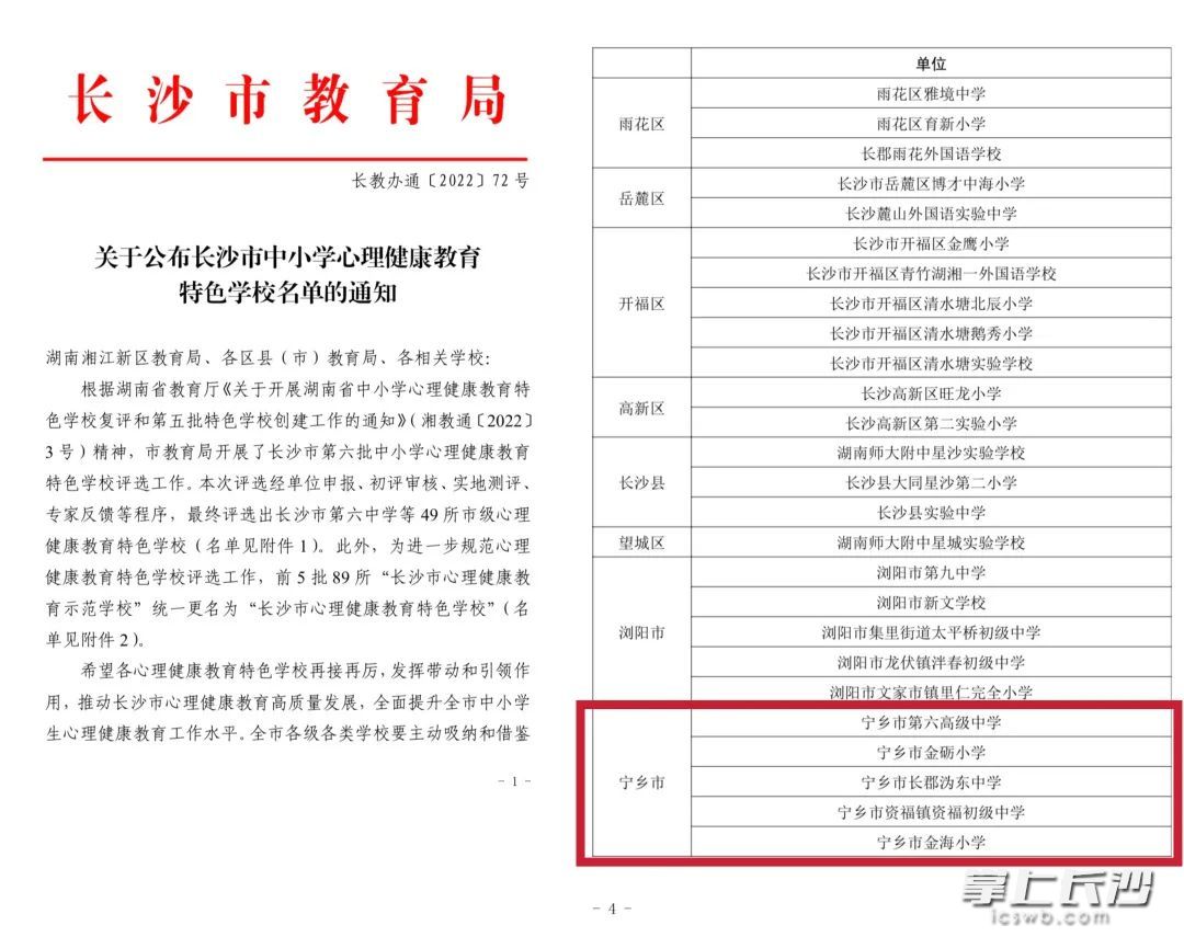 长沙晚报掌上长沙12月26日讯 近日,宁乡市教育局陆续对五所申报学校开展了初评。宁乡市宁乡六中、长郡沩东中学、资福中学、金砺小学、金海小学入选长沙市第六批中小学心理健康教育特色学校。