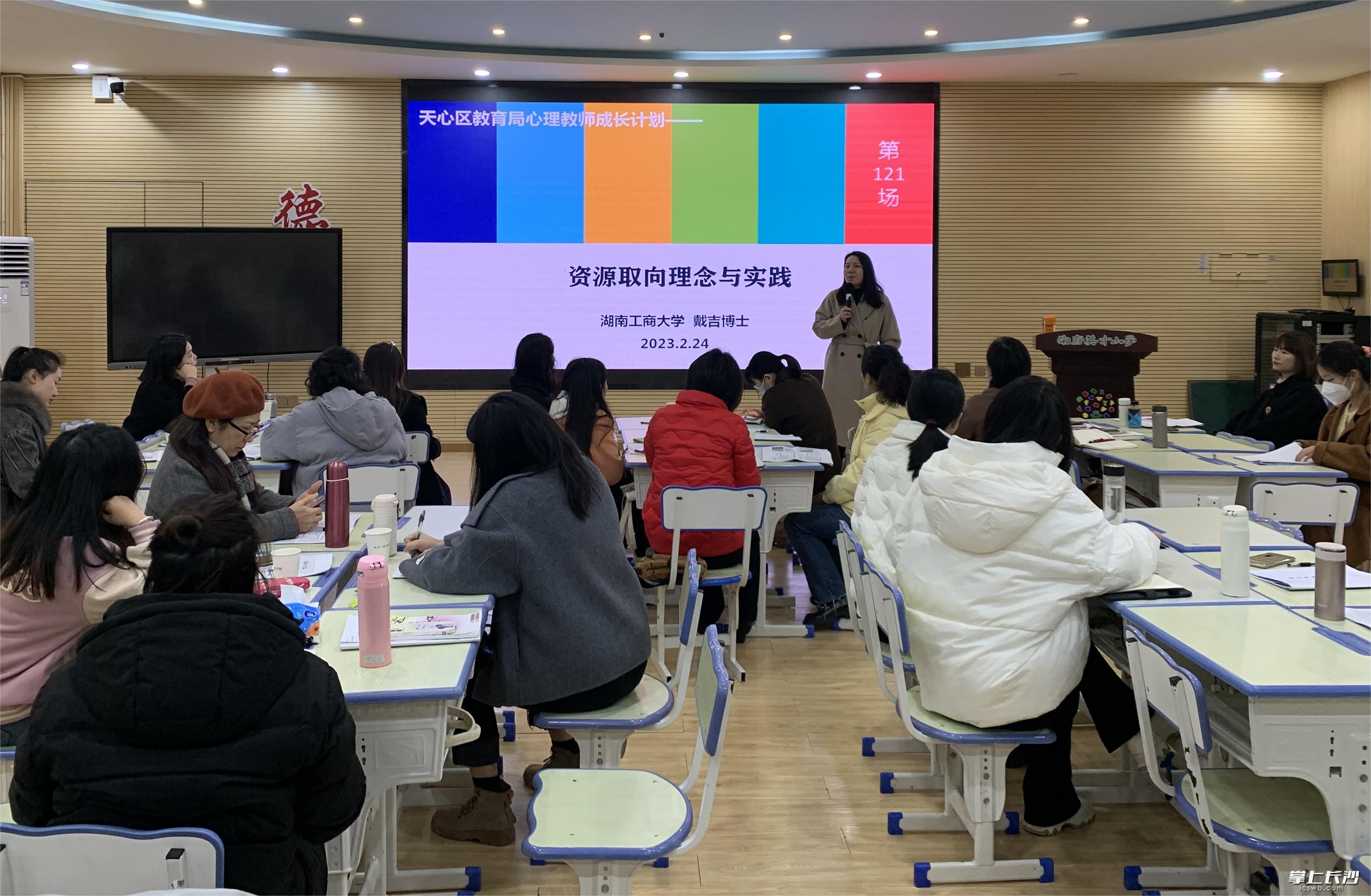 长沙晚报掌上长沙2月27日讯 (通讯员 王雨琪) 24日,天心区心理健康教育教师专训营第二期培训在该区实验小学举行。本期专训营由天心区教育局主办,区艺术体育中心承办,区实验小学、湘府英才小学协办。湖南工商大学戴吉教授与36名天心区心育教师参加。