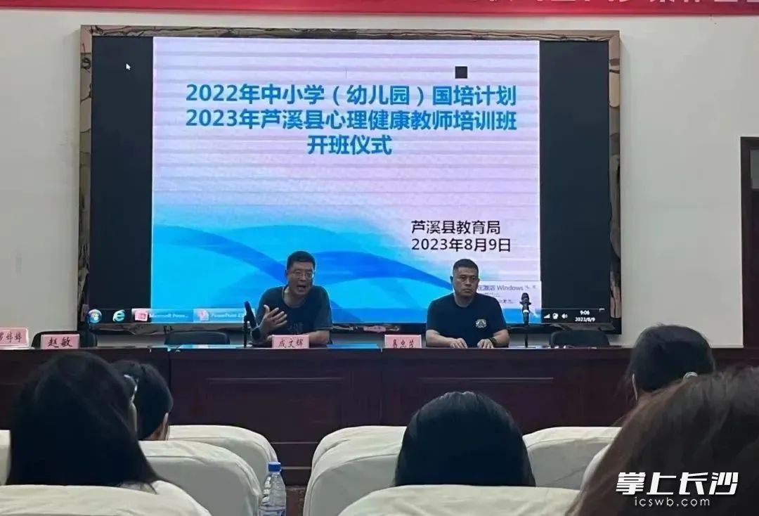 9日上午,芦溪县教育局教育股股长易忠茂主持了开班仪式,他对专委会导师团的到来表示热烈欢迎,特别感谢专家组能针对芦溪县当下的心理健康教育工作现状,设计有内容、有实操、贴近现实的培训课程。易忠茂说,心理健康教育工作是教育工作中的重要内容,对学生长远发展有着举足轻重的作用。县政府教育督导室主任成文辉表示,要落实好心理健康教教育,如心理咨询室硬件标准化,教师配备标准化,心理健康课程开设好等。他鼓励全体受训老师认真学习,并结合此次培训内容有针对性地筹划接下来的心理健康教育工作,让芦溪心育更上一层楼。