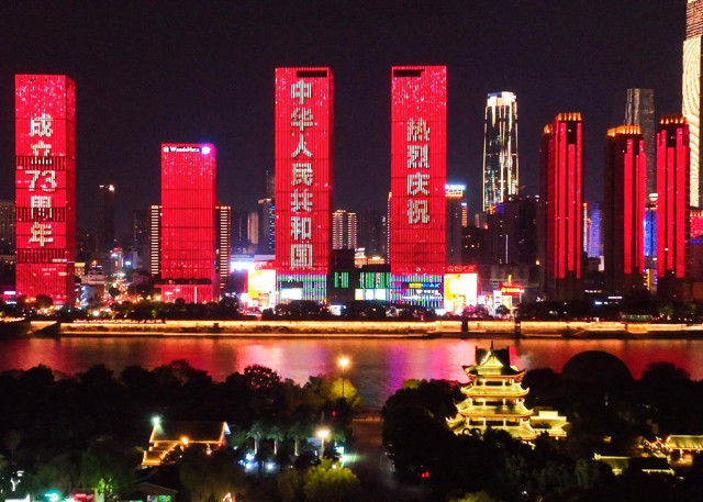 在这场灯光秀中,“热烈庆祝中国人民警察节”“对党忠诚、服务人民、执法公正、纪律严明” “公安心向党、护航新征程”“矢志不渝110、新征程上保安宁”等庆祝标语特别醒目,流光溢彩、气势磅礴的灯光秀与万家灯火交相辉映,勾勒出一幅幅平安长沙的美丽画卷。