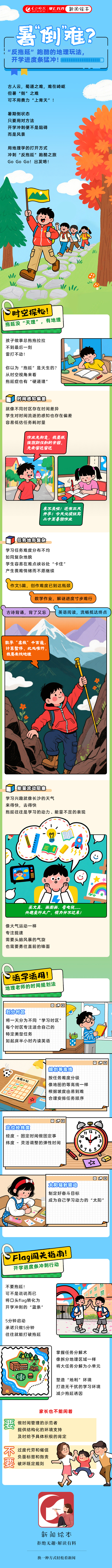 暑“倒”难?“反拖延”跑酷的地理玩法,开学进度条猛冲! | 新闻绘本 稿源:掌上长沙2025-08-29 10:39 相链区块链 该文章已上链>> 您的浏览器不支持 video 标签。 您的浏览器不支持 audio 标签。 开学已进入倒计时,长沙市教育名师、长沙市优秀班主任,首批长沙市地理学科基地负责人——来自周南中学的方章明老师在线分享如何用“地理思维”,帮助孩子从暑假模式切换到高效新学期状态,告别拖延症。 作者:周意 刘家婧 编辑:罗敏 素材提供:张炎炎告别拖延症!用“时间地图”开启高效新学期 【作者:周意 刘家婧 罗敏 张炎炎】 【编辑:周意】 长沙晚报社版权声明 关键词: >>我要举报