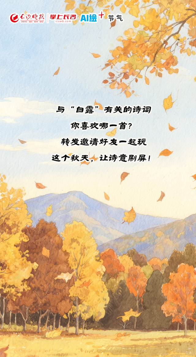 白露“飞花令”!这个秋天,让诗意刷屏~ | AI绘节气 稿源:掌上长沙2025-09-07 07:08 相链区块链 该文章已上链>> 您的浏览器不支持 video 标签。 您的浏览器不支持 audio 标签。 古人把节气秋韵,藏在绝美的诗句里,等你来发现!这段文字防止纯图片不显示这段文字防止纯图片不显示这段文字防止纯图片不显示这段文字防止纯图片不显示这段文字防止纯图片不显示作者:刘可馨 赖立AI制作:赖立编辑:罗敏 【作者:刘可馨 赖立 罗敏】 【编辑:刘可馨】 长沙晚报社版权声明 关键词: >>我要举报