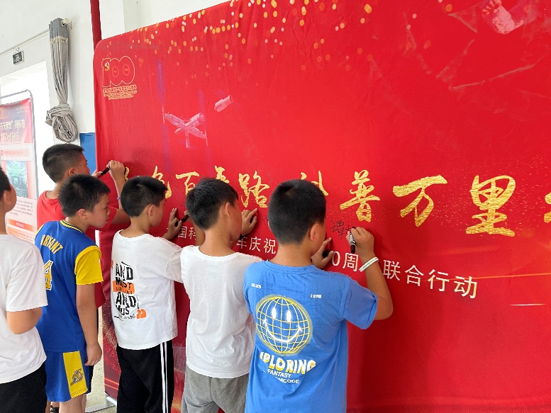 活动现场,学校孩子们一起参观了《庆祝建党百年主题展览》,展板由中国科技馆为全国科普大篷车统一制作配发,以图文展板的形式回望中国共产党的百年征程。观看后,孩子们把观看红色主题科普展览的所思所想写到了记录本上,并在队旗上签上自己的名字,以此为中国共产党百年华诞献礼。