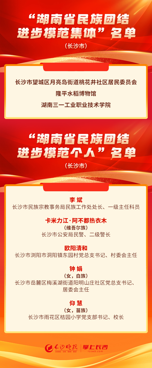 长沙市3个集体、5名个人荣获湖南省民族团结进步模范表彰 稿源:掌上长沙2025-10-15 23:37 相链区块链 该文章已上链>> 您的浏览器不支持 video 标签。 您的浏览器不支持 audio 标签。 10月15日,湖南省民族团结进步表彰大会召开,会上宣读了《中共湖南省委 湖南省人民政府关于表彰湖南省民族团结进步模范集体和模范个人的决定》,长沙这些集体和个人被表彰!相关链接:湖南省民族团结进步模范集体和模范个人全名单来了作者:杨倩杰 刘家婧编辑:罗敏素材来源:湖南日报 【作者:杨倩杰 刘家婧 罗敏】 【编辑:杨倩杰】 长沙晚报社版权声明 关键词: >>我要举报