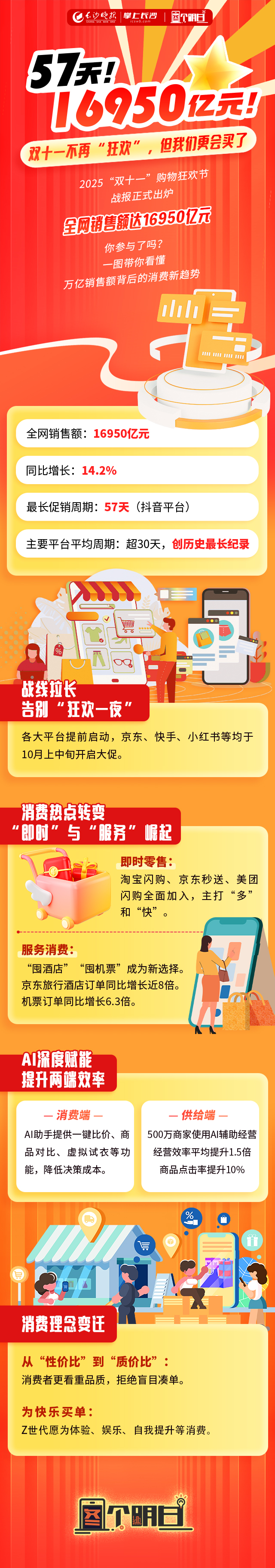 57天!16950亿元!双十一不再“狂欢”,但我们更会买了 | 图个明白 稿源:掌上长沙2025-11-14 07:08 相链区块链 该文章已上链>> 您的浏览器不支持 video 标签。 您的浏览器不支持 audio 标签。 今年双十一静悄悄卖了16950亿元!AI购物、即时零售、囤酒店成新趋势,一图带你看懂消费新变革。作者:杨倩杰 刘家婧编辑:曾茜素材提供:贾凯清 【作者:杨倩杰 刘家婧 曾茜】 【编辑:杨倩杰】 长沙晚报社版权声明 关键词: >>我要举报