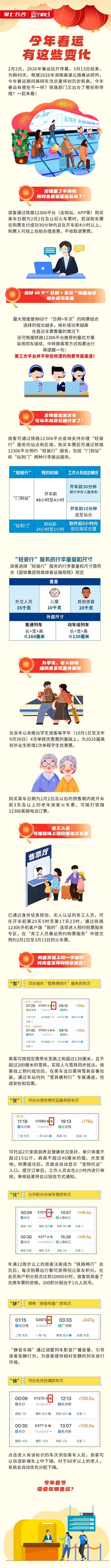 抢票注意!今年春运有这些变化,你知道吗?丨图个明白 稿源:掌上长沙2026-01-29 21:48 相链区块链 该文章已上链>> 您的浏览器不支持 video 标签。 您的浏览器不支持 audio 标签。 2月2日,2026年春运拉开序幕,3月13日结束,为期40天。根据2026年湖南高速公路春运研判,今年春运期间路网车流总量将创历史新高。今年春运有哪些不一样?铁路部门又出台了哪些新举措?一起来看!作者:肖娟 赖立编辑:罗敏 【作者:肖娟 赖立 罗敏】 【编辑:肖娟】 长沙晚报社版权声明 关键词: >>我要举报