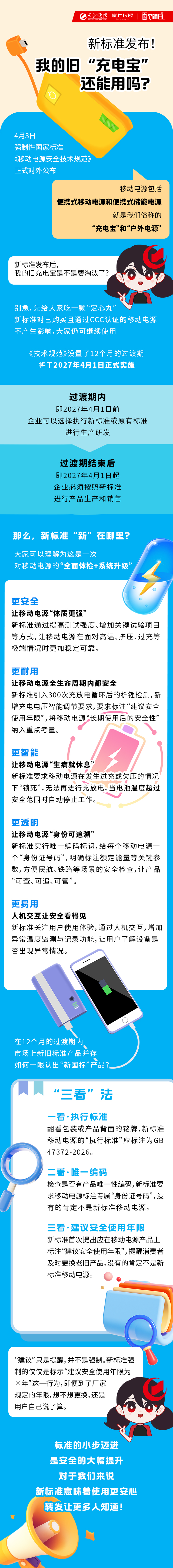 新标准发布!我的旧“充电宝”还能用吗? | 图个明白 稿源:掌上长沙2026-04-03 15:56 相链区块链 该文章已上链>> 您的浏览器不支持 video 标签。 您的浏览器不支持 audio 标签。 4月3日,强制性国家标准《移动电源安全技术规范》正式对外公布。新标准“新”在哪里?旧的“充电宝”还能不能用?一起来看!作者:刘可馨 王聘编辑:曾茜综合:工业和信息化部官方号“工信微报” 【作者:刘可馨 王聘 曾茜】 【编辑:刘可馨】 长沙晚报社版权声明 关键词: >>我要举报