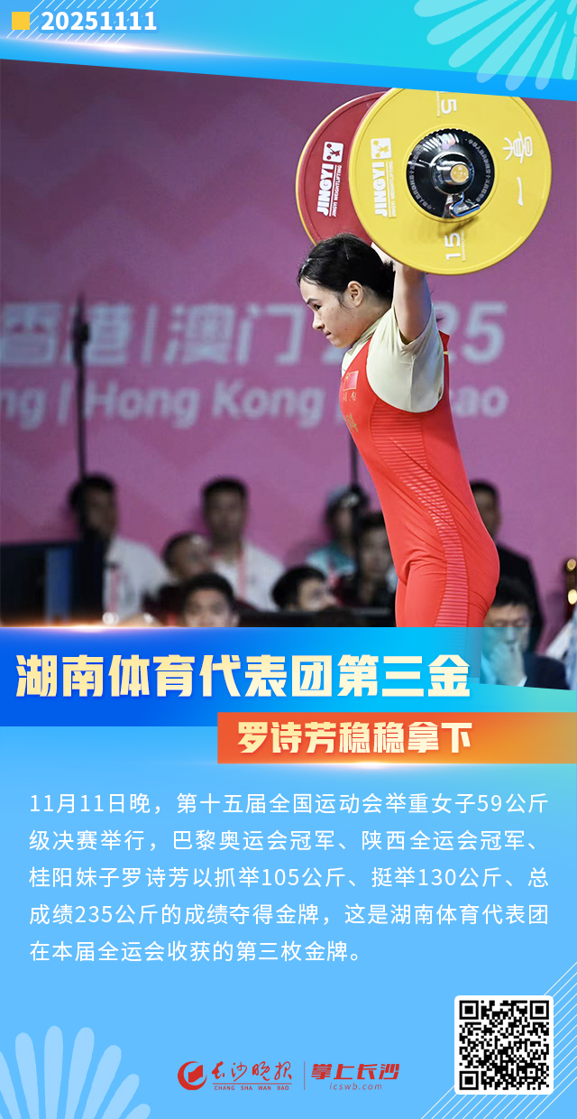 湖南体育代表团第三金!罗诗芳稳稳拿下|新闻海报 稿源:掌上长沙2025-11-11 21:18 相链区块链 该文章已上链>> 您的浏览器不支持 video 标签。 您的浏览器不支持 audio 标签。 11月11日晚,第十五届全国运动会举重女子59公斤级决赛举行,巴黎奥运会冠军、陕西全运会冠军、桂阳妹子罗诗芳以抓举105公斤、挺举130公斤、总成绩235公斤的成绩夺得金牌。作者:谭伟 刘家婧编辑:曾茜素材提供:赵紫名 王志伟 【作者:谭伟 刘家婧 曾茜 赵紫名 王志伟】 【编辑:谭伟】 长沙晚报社版权声明 关键词: >>我要举报