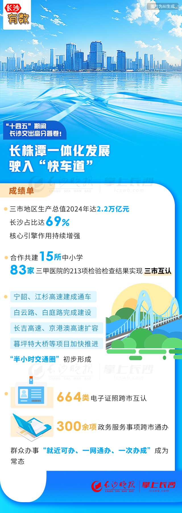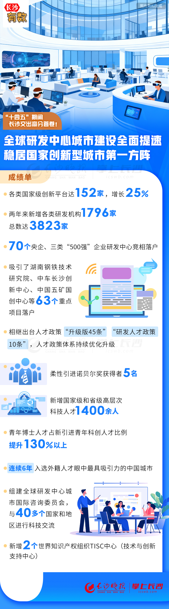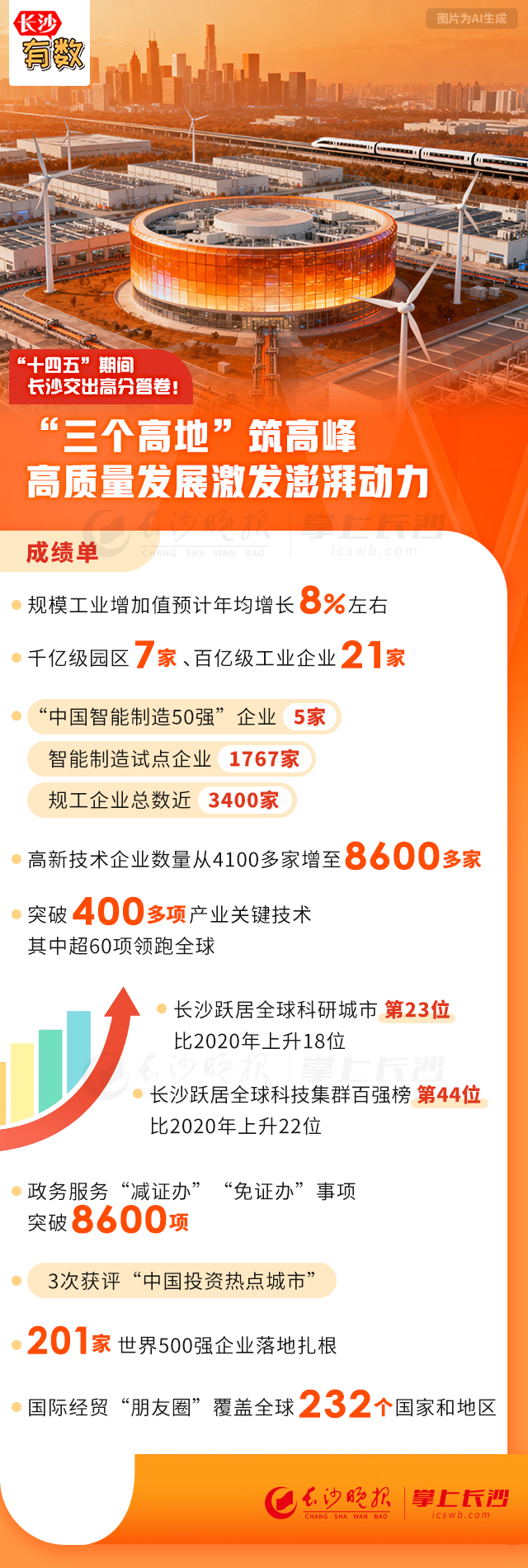 “十四五”期间,长沙交出高分答卷! | 长沙有数 稿源:掌上长沙2025-11-28 07:41 相链区块链 该文章已上链>> 您的浏览器不支持 video 标签。 您的浏览器不支持 audio 标签。 11月27日,湖南“十四五”答卷系列主题新闻发布会长沙专场举行,现场发布了长沙市“十四五”期间经济社会发展的有关情况。这五年,星城长沙以凌云之志,锚定“三高四新”宏伟蓝图,创新实干、勇立潮头,于时代大考中交出一份高分答卷。作者:黄丽心 李卓 刘家婧编辑:肖文娟素材提供:黄汝兮星城正芳华 今朝更好看|非凡“十四五” 【作者:黄丽心 李卓卓 刘家婧 肖文娟 黄汝兮】 【编辑:黄丽心】 长沙晚报社版权声明 关键词: >>我要举报