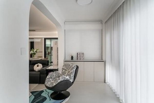 从阳台望向公区,黑白色调简约内敛,大白墙设计让空间更显简洁清爽。黑色沙发、白色茶几与电视墙相得益彰,优雅而不失格调。