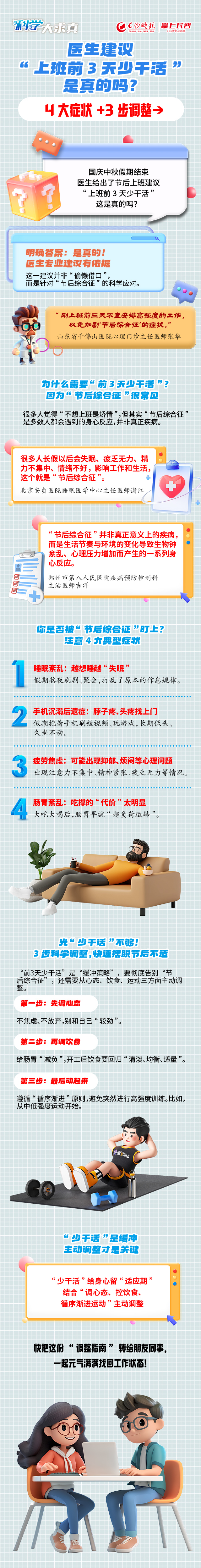 医生建议“上班前3天少干活”,是真的吗?|科学大求真 稿源:掌上长沙2025-10-09 20:15 相链区块链 该文章已上链>> 您的浏览器不支持 video 标签。 您的浏览器不支持 audio 标签。 国庆中秋假期结束,医生给出了节后上班建议……作者:谭伟 赖立编辑:曾茜素材来源:掌上长沙、央视新闻、人民日报等 【作者:谭伟 赖立 曾茜】 【编辑:谭伟】 长沙晚报社版权声明 关键词: >>我要举报