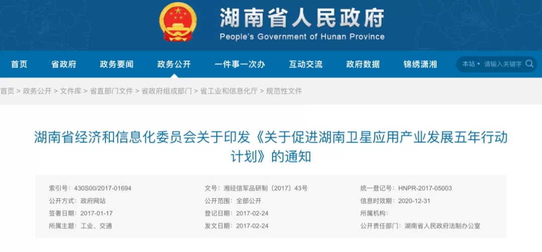 2014年10月,湖南省政府出台了《关于促进地理信息产业发展的实施意见》,将卫星导航产业作为重点扶持产业。