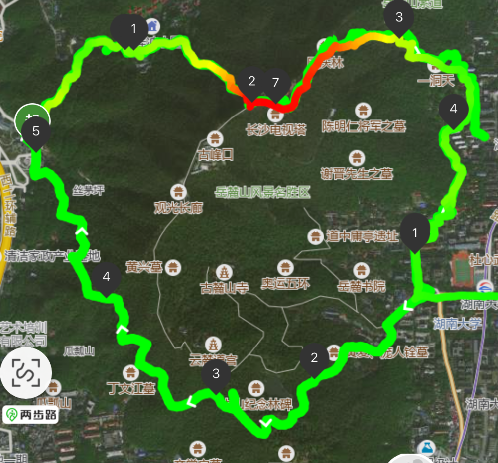 只要徒步者完成整条线路,定位软件上就会呈现出一个非常完整、明显的心形图案。路线全长约8.5公里,不仅串联了湖南大学、电视塔等标志性建筑,沿途还有众多古树名木和名人陵墓,兼具自然和人文景观。