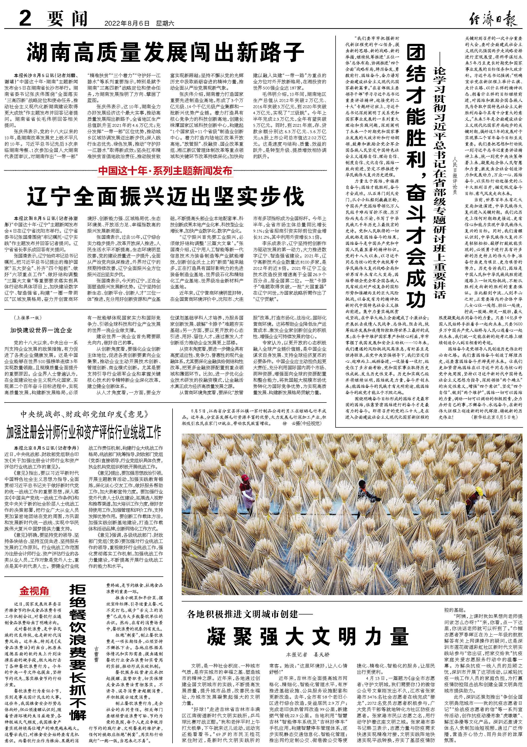 张庆伟表示,党的十八大以来的10年,是湖南改革发展史上极不平凡的10年。习近平总书记先后3次亲临湖南考察、1次参加全国人大湖南代表团审议,对湖南作出“一带一部”“精准扶贫”“三个着力”“守护好一江碧水”等系列重要指示,特别是赋予湖南“三高四新”战略定位和使命任务,为湖南发展指明了方向、擘画了蓝图。