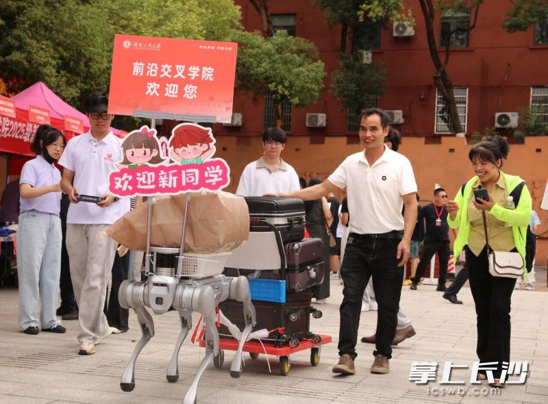 在国防科大,“智行者”机器人穿梭迎新现场,为新学员热心指路;在湖南工商大学,大型行李搬运机器狗举着迎新立牌,贴心搬运行李;而在长沙学院,新生和家长们戴上VR设备,通过虚拟场景“云游”张家界……在长沙上大学也太酷了吧!