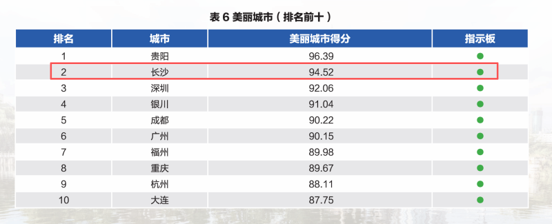 《报告》美丽城市前十排名依次为:贵阳、长沙、深圳、银川、成都、广州、福州、重庆、杭州、大连。长沙以94.52分位居全国第二,仅次于“森林之城”贵阳。