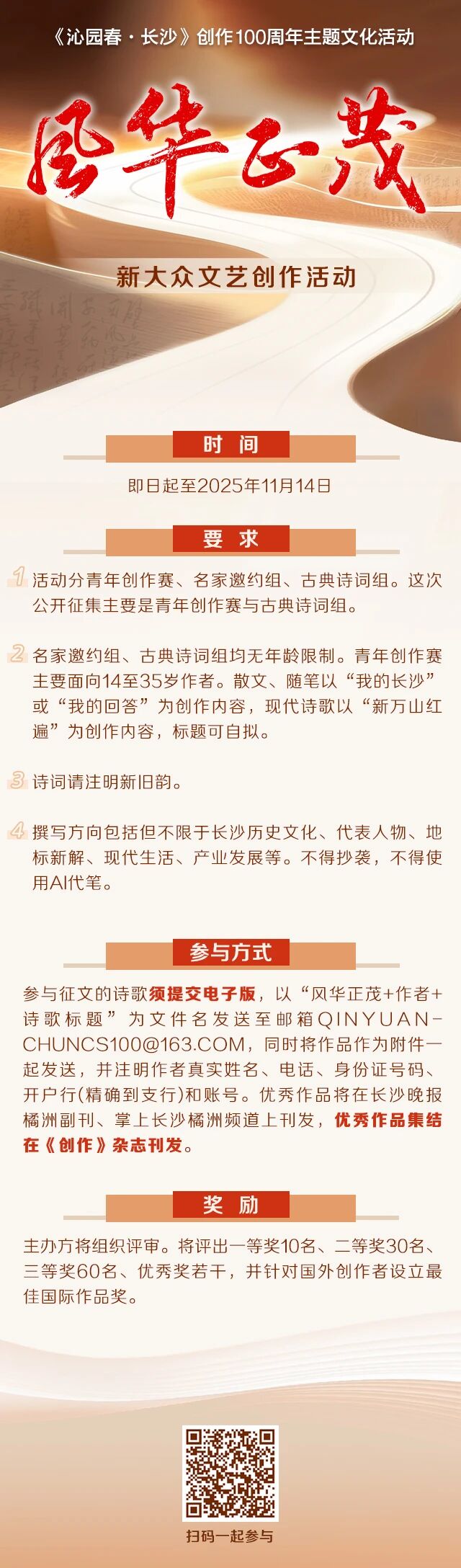 在《沁园春·长沙》创作100周年之际,我们以诗为媒,发起“风华正茂”新大众文艺创作活动,既有对历史的回望,也有对当下的礼赞,更有对未来的期许。