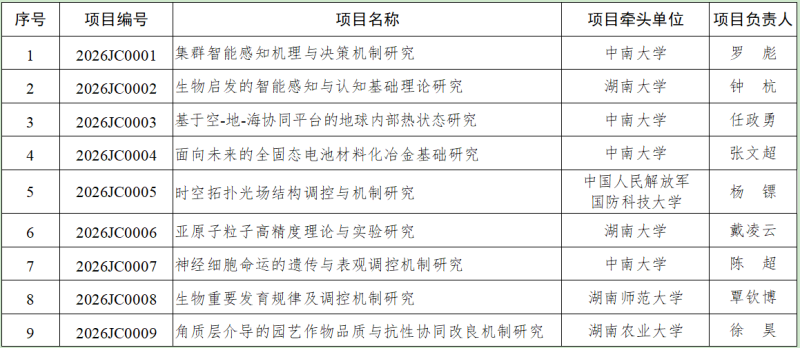 此次立项的项目主要聚焦人工智能(具身智能)、先进材料(未来能源)、空天海洋、类脑科学等领域。包括“集群智能感知机理与决策机制研究”“生物启发的智能感知与认知基础理论研究”“基于空-地-海协同平台的地球内部热状态研究”“面向未来的全固态电池材料化冶金基础研究”“时空拓扑光场结构调控与机制研究”“亚原子粒子高精度理论与实验研究”“神经细胞命运的遗传与表观调控机制研究”“生物重要发育规律及调控机制研究”“角质层介导的园艺作物品质与抗性协同改良机制研究”“细胞器互作网络调控线粒体稳态的机制研究”。牵头单位为国防科技大学、中南大学、湖南大学、湖南师范大学、湖南农业大学、南华大学等高校。