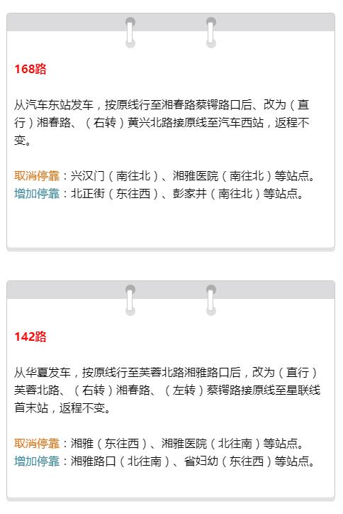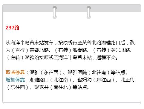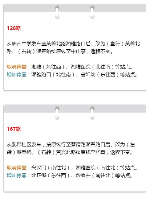 根据相关通知,8月17日至12月16日(以实际围挡时间为准),湘雅路蔡锷路口禁止机动车辆由东往南和由南往西左转。为保证施工顺利和道路安全,原行经该路段的128路、167路、168路、142路、237路等5条公交线路将进行临时调整,湘雅(东往西)、湘雅医院(北往南)、兴汉门(南往北)等站点将取消停靠,将增加湘雅路口(北往南)、省妇幼(东往西)、北正街(东往西)、彭家井(南往北)等站点停靠。