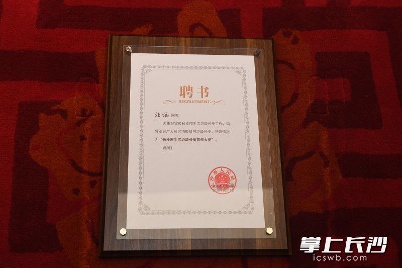 长沙晚报掌上长沙9月11日讯(全媒体记者 唐朝昭)2020年是长沙市“生活垃圾分类工作提升年”,为切实提升广大市民对垃圾分类工作的支持率和参与率,长沙市人民政府聘请湖南省政协常委、湖南广播电视台主持人汪涵为“长沙市生活垃圾分类宣传大使”。11日上午,聘请仪式举行。副市长朱东铁为汪涵颁发聘书。