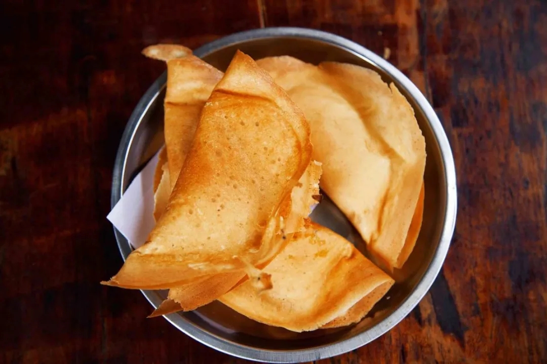 蛋烘糕,应该没有人不喜欢这酥脆可口的小玩意吧。以专用铜制小平锅将面粉与鸡蛋和成的面糊烘熟,再包入咸馅或甜馅食用。香喷喷,金灿灿,绵软滋润,外皮酥脆,营养丰富,老少皆宜。