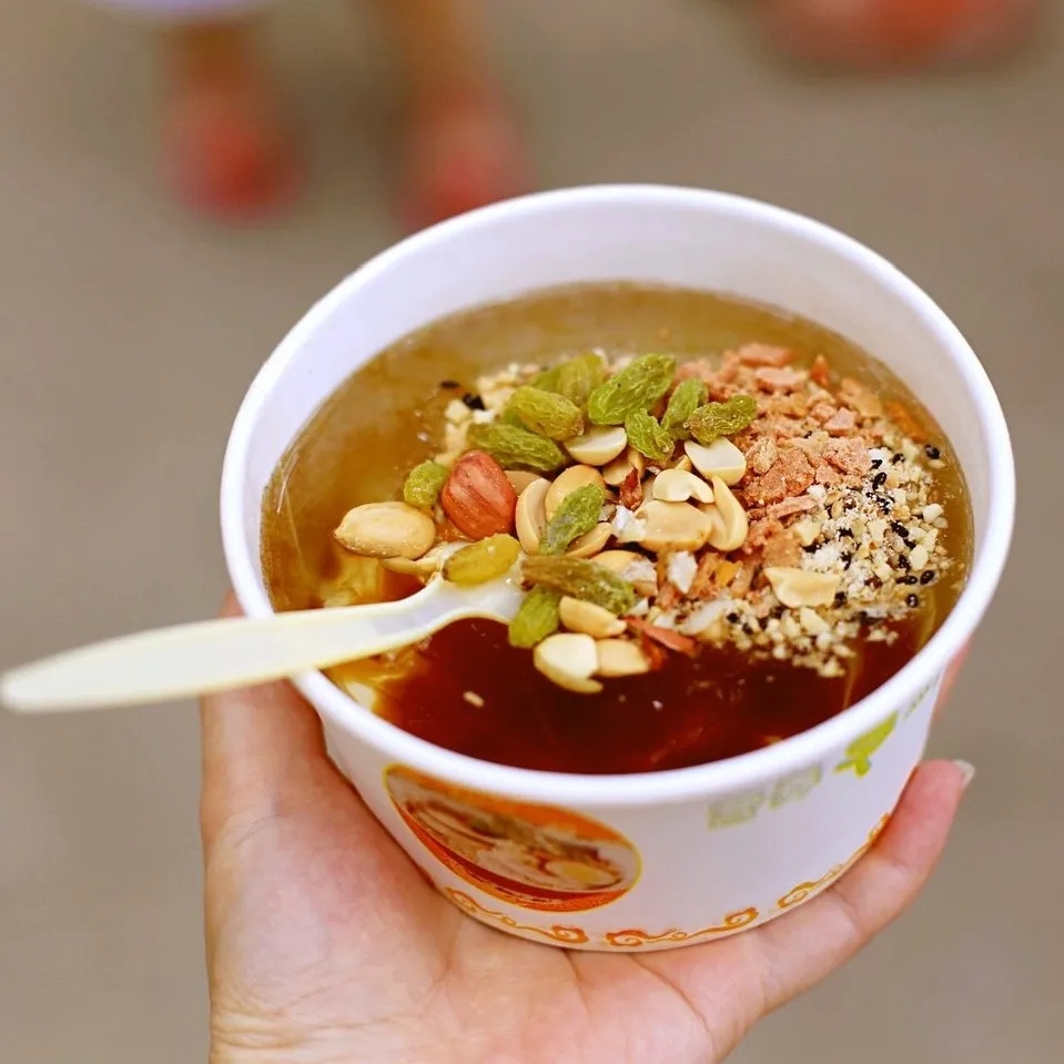 冰粉不是四川的凉粉,是在成都沿街叫卖的一种甜品。吃了太多辣之后,喝了一碗又凉又甜的冰粉,里面加上红糖,花生,葡萄干,正好降火。