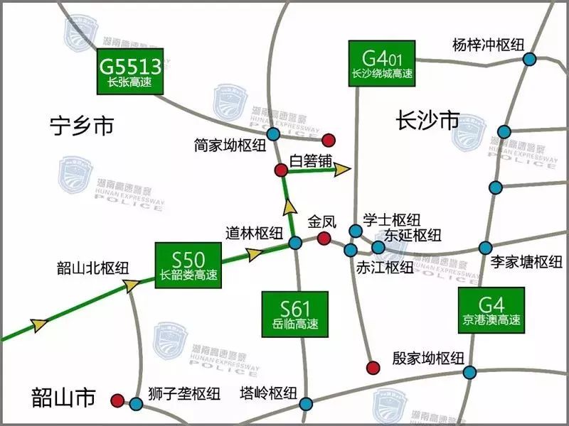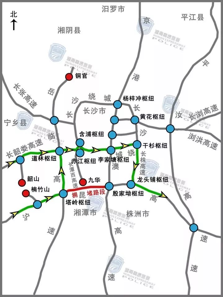 沪昆高速湘潭拥堵路段绕行:沪昆高速→塔岭枢纽→道林枢纽→赤江枢纽→长沙绕城高速→干杉枢纽→长株高速→龙头铺枢纽→沪昆高速