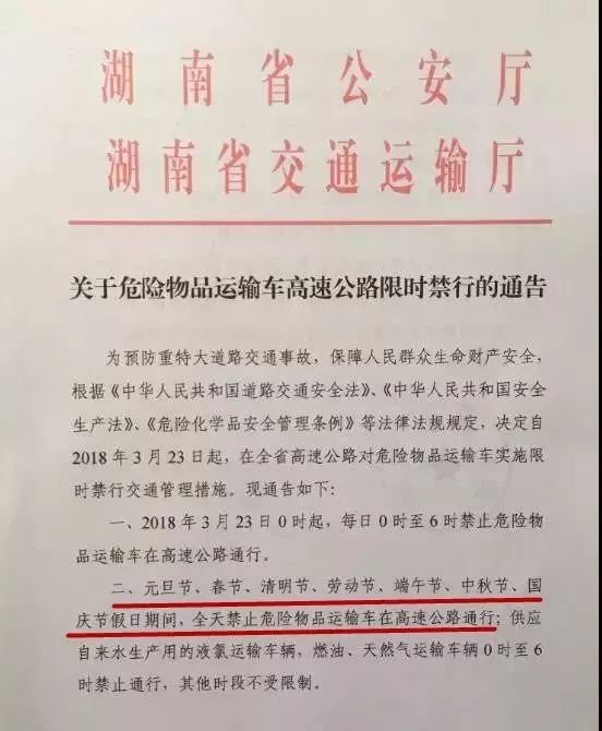 根据省公安厅和省交通运输厅近日联合发布的《关于危险物品运输车高速公路限时禁行的通告》,危险物品运输车辆在端午节假期期间全天24小时禁止在高速公路通行(供应自来水生产用的液氯运输车辆,燃油、天然气运输车辆0时至6时禁止通行,其他时段不受限制)。