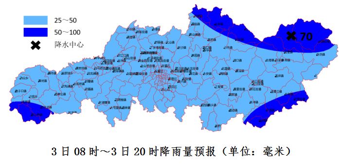 市气象台预计,3日白天,我市大部分地区中到大雨,宁乡西南部、长沙县北部、浏阳北部和南部局地暴雨,降雨量20毫米至30毫米、局地50毫米至70毫米;3日夜间阴天,东部小雨转阴天。