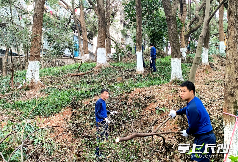 公园山体区域地形复杂,灾后清理工作难度大。得知情况后,国防科技大学军政基础教育学院、电子信息学院和湘湖消防救援站主动请缨,承担起倒伏树木清理任务,从3月8日开始至今日,连续作战三天,将倒伏树木和断枝全部清理干净。