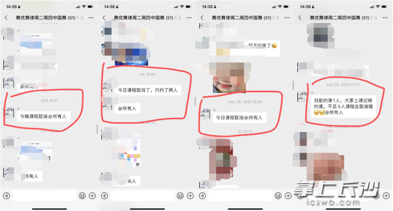 “因为他们经常临时取消课程,有好几次我准备去上课时,他们就说今天的课程取消了。”胡同学告诉记者。而这些被取消的课程是不会再补上的,这意味着每取消一次课,胡同学的培训次数就少了一次。“我两张卡加起来到现在只上了17次课,一共被取消了8次课。”根据胡同学提供的聊天记录,记者注意到,从去年12月26日到今年2月27日,舞忧舞律舞蹈工作室以约课人数不够为由,取消了8次课。