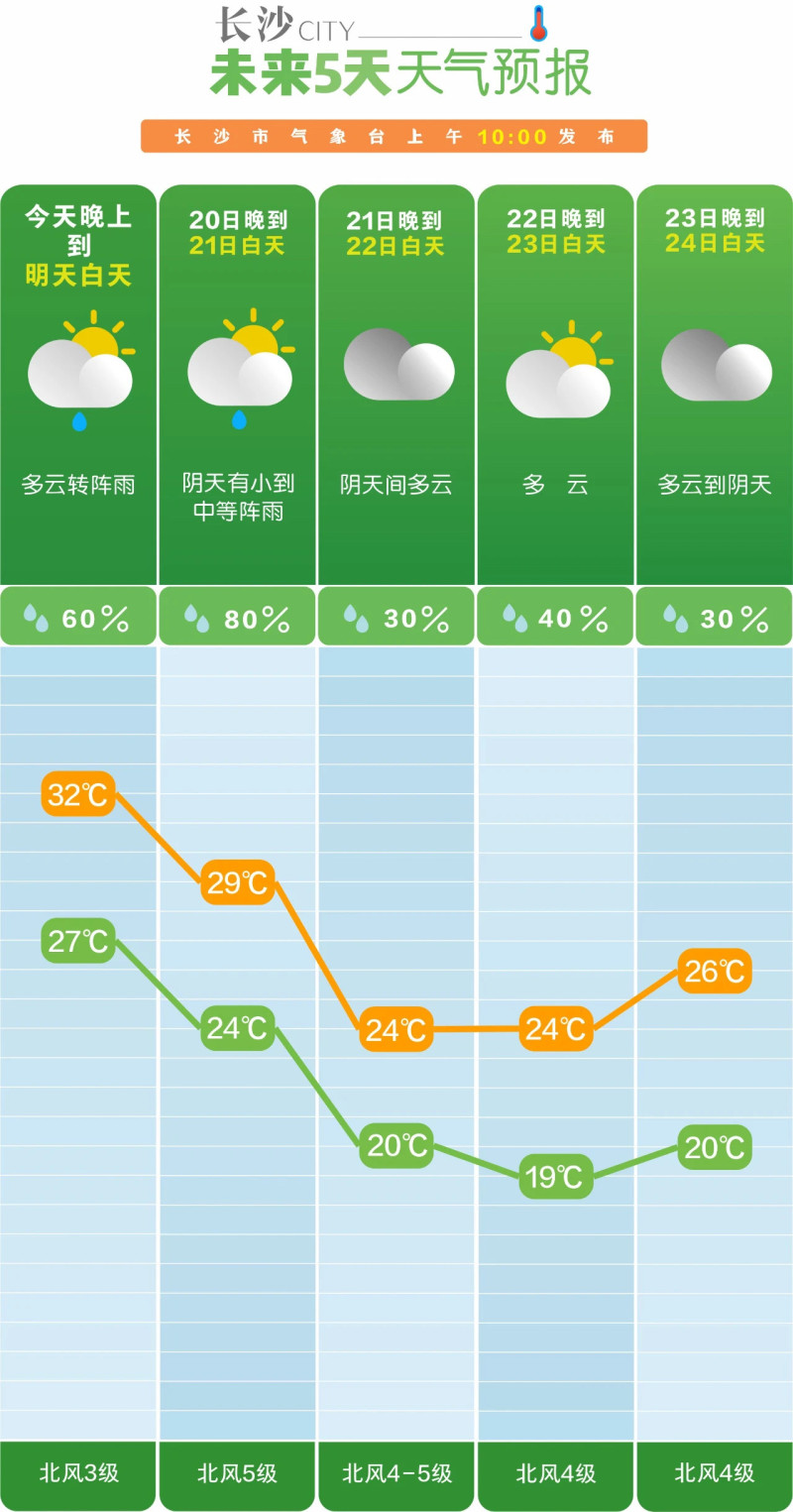 记者从长沙市气象台了解到,总体来看未来一周降水偏少,21日到23日有一次降温大风过程。其中,19日晚到20日,长沙多云转阵雨,27℃至32℃;21日到23日,冷空气南下,气温下降8℃至10℃,北风加大至5级、阵风7到8级,并伴有弱降水;24日到26日,阴天到多云,部分时段有分散阵雨。