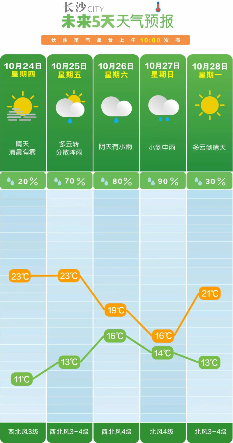 霜降已至,昼夜温差较大,早晚时段凉意十足。省气象台预计,23日晚至25日白天,受槽后偏北气流控制,全省晴天到多云;25日夜间至26日白天,受台风外围云系影响,湘南有阵性降水。