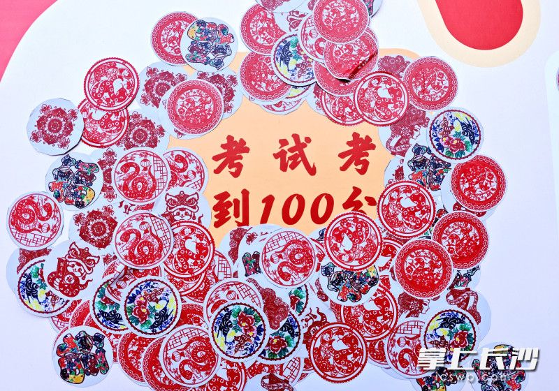 在剪纸心愿背景墙前,同学们手持红纸,巧手翻飞,将新学期的期望化作一幅幅灵动的剪纸作品。“希望数学考满分”“我要把这张精美的剪纸送给爸爸妈妈”……童真的心愿与非遗技艺相得益彰。心愿墙上“考试考到100分”则成了同学们纷纷“打卡”的热点区。